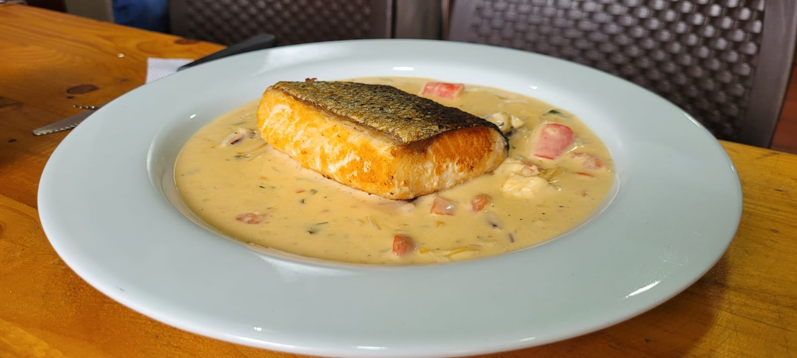 Exquisito corte de salmón acompañado de salsa a base de mariscos