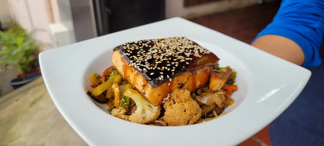 Exquisito corte de salmón acompañado de vegetales al mejor estilo oriental