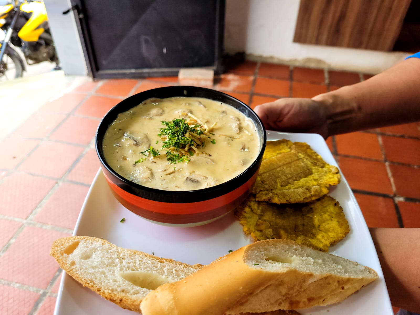 Acompañada de pan baguette y patacón
